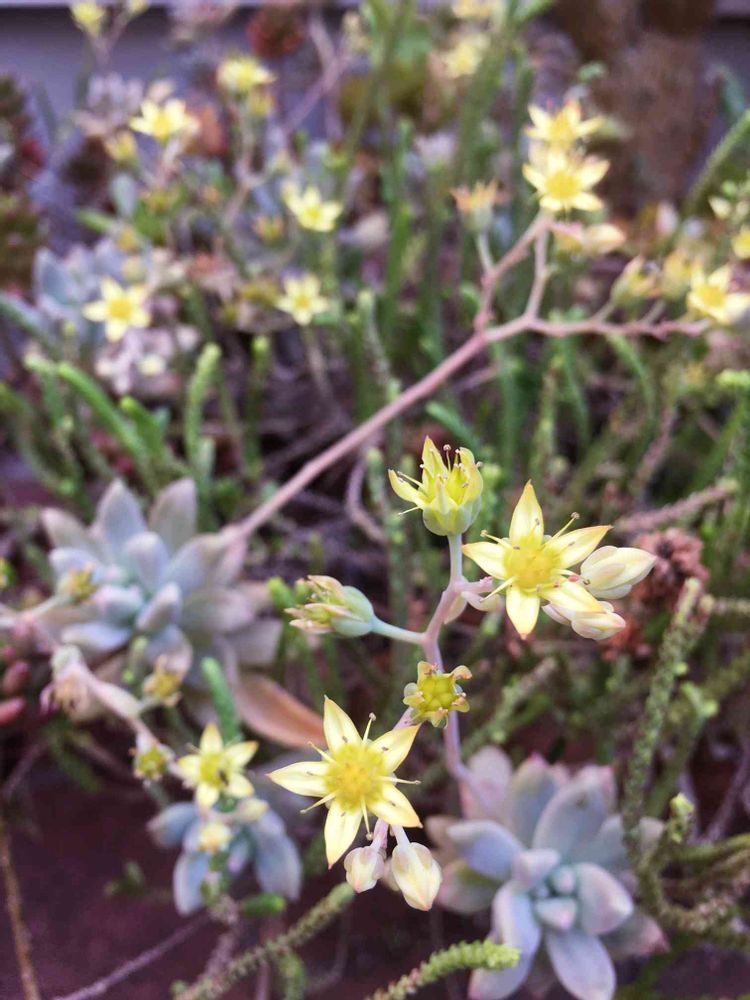 おはようございます。植えっぱなしで10年以上。多肉ちゃんの大鉢は花ざかり
