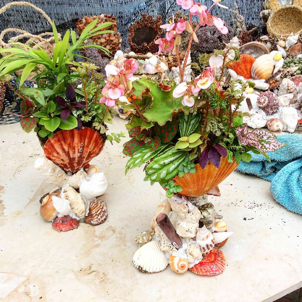貝殻と砂利を樹脂で固めていろいろな鉢を作っています。 また、ロックウールを使った誰もが簡単にできる寄せ植えを紹介しています。
