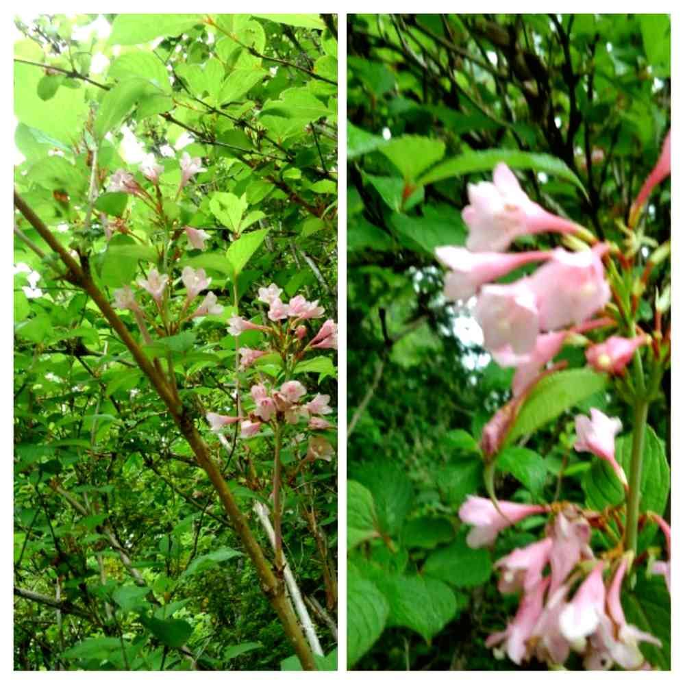 花は枝先や葉腋から総状花序を上や斜めに出して漏斗形の花を横向きに多数咲かせます。色は野生種はピンク色ですが、濃い紅色のベニウツギも有ります。