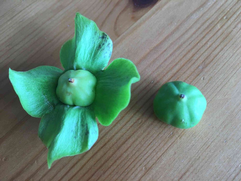 柿の花のあと、ポロポロ落ちてくる。見てみるとカワイイ柿の実!