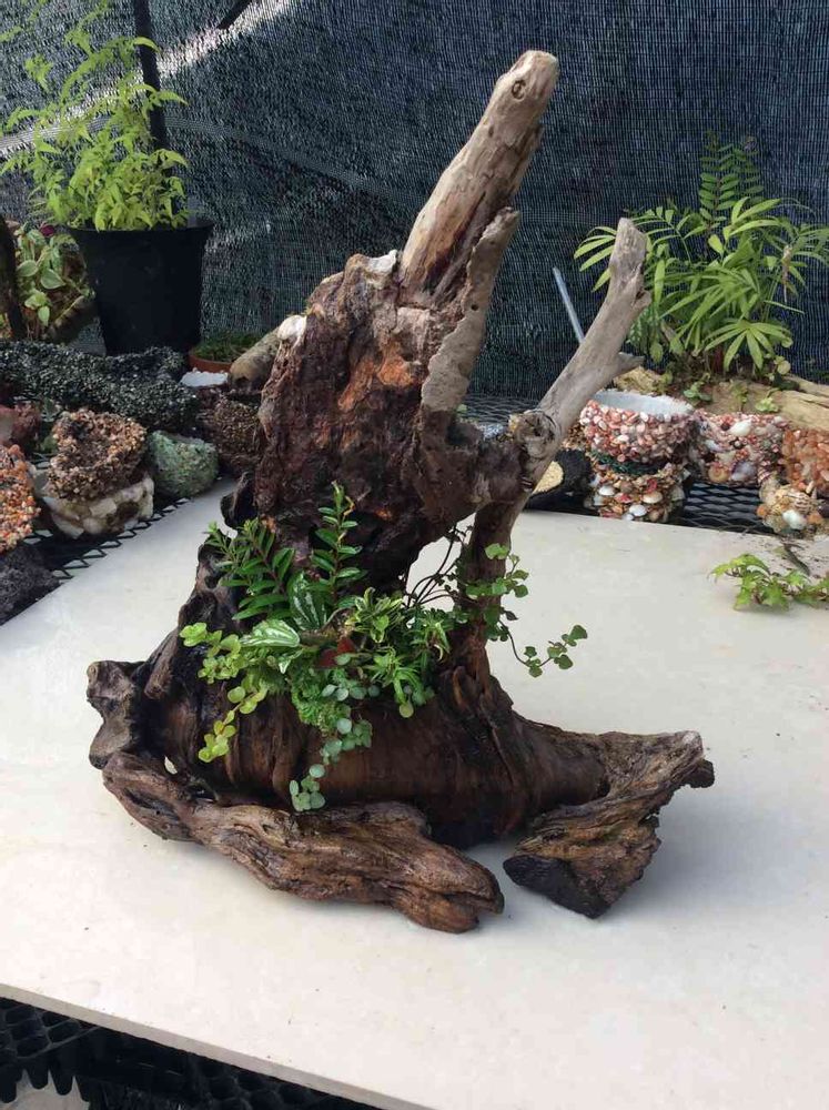 流木にロックウールで植えて、挿し木しました。