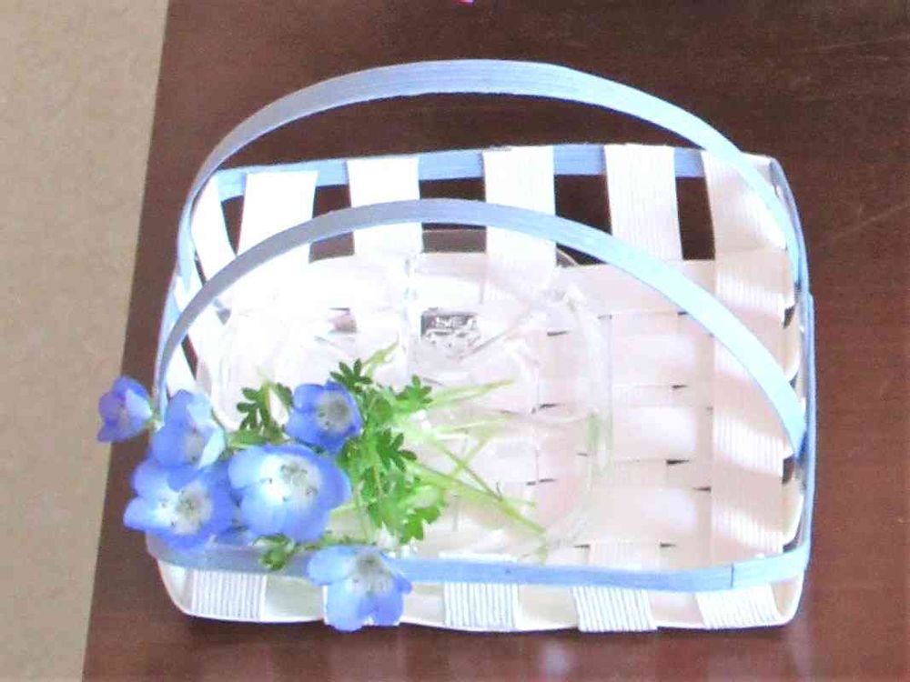むすめが育てているネモフィラをむすめが摘んでかざりました。