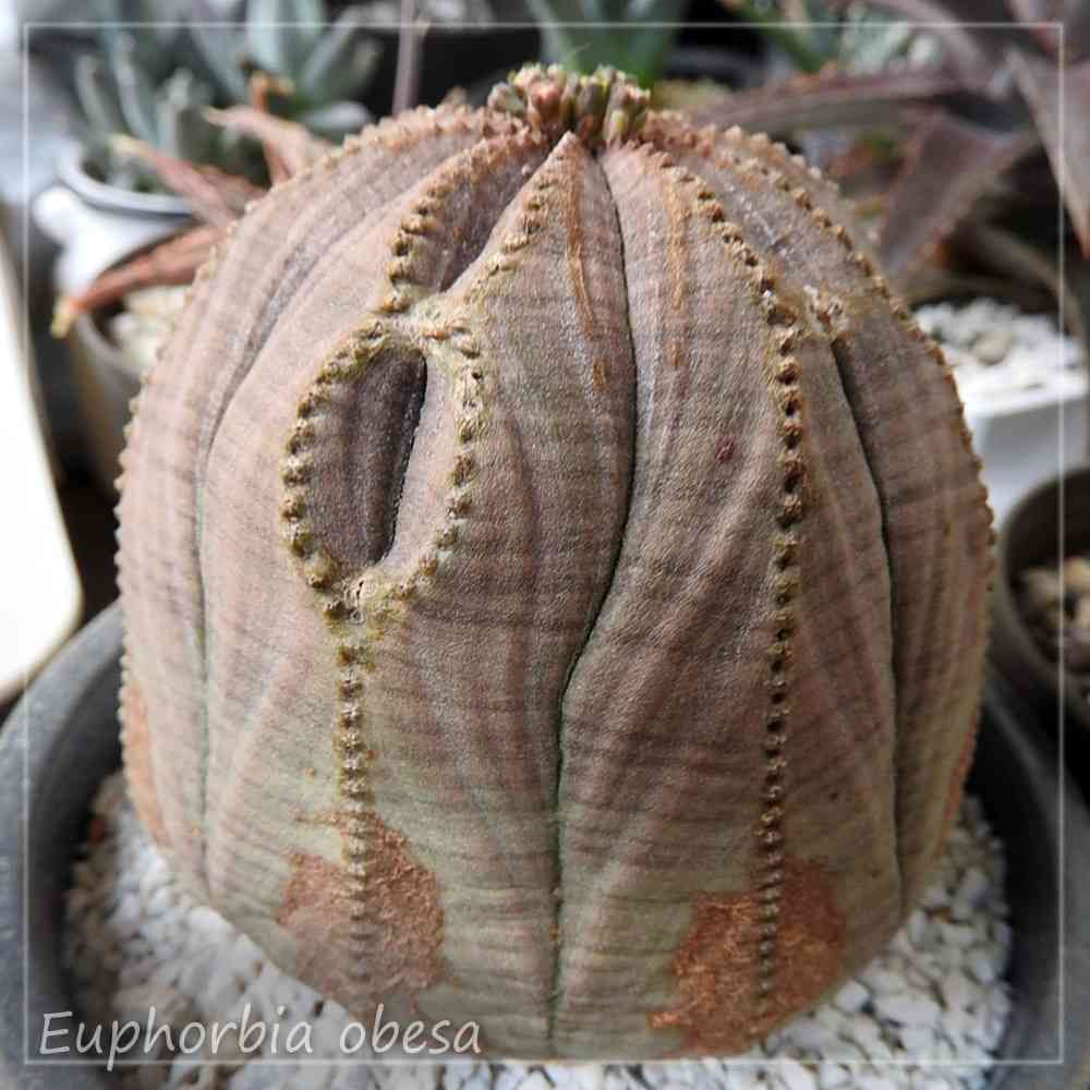 オベサ。一昨年に買ったものを植え替え。こんな姿だけど、実は根っこはねずみのしっぽみたいに伸びていて、以外に深い鉢が必要。洋蘭鉢を使っていたけど、このオベサの場合はそれではきつきつになってしまっていたので、やっとよさげな鉢を見つけて植え替えた。