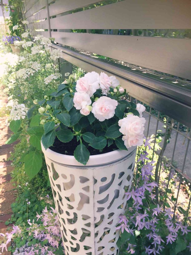 小さな庭,八重咲きインパチェンス・シルエット・アップルブロッサム,カンパニュラ アルペンブルーの投稿画像