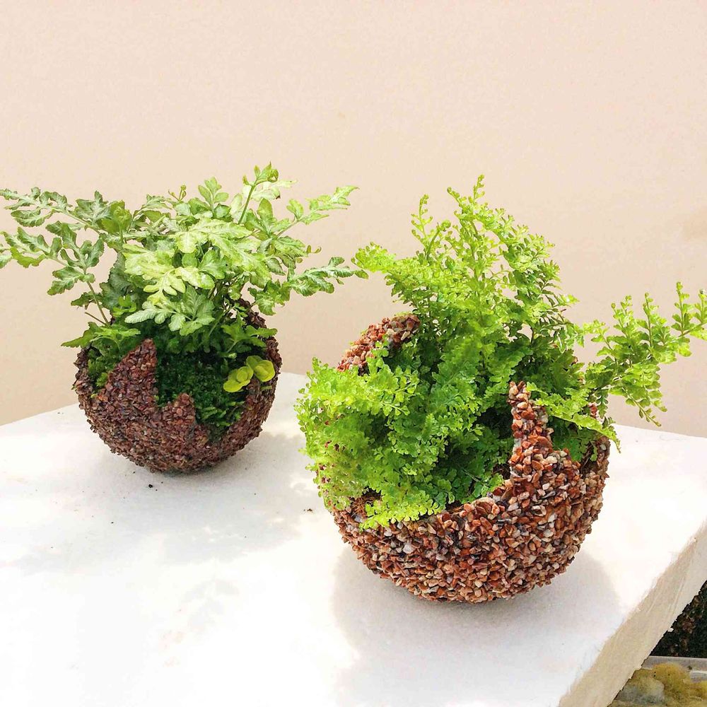 貝殻と砂利を樹脂で固めていろいろな鉢を作っています。 また、ロックウールを使った誰もが簡単にできる寄せ植えを紹介しています。