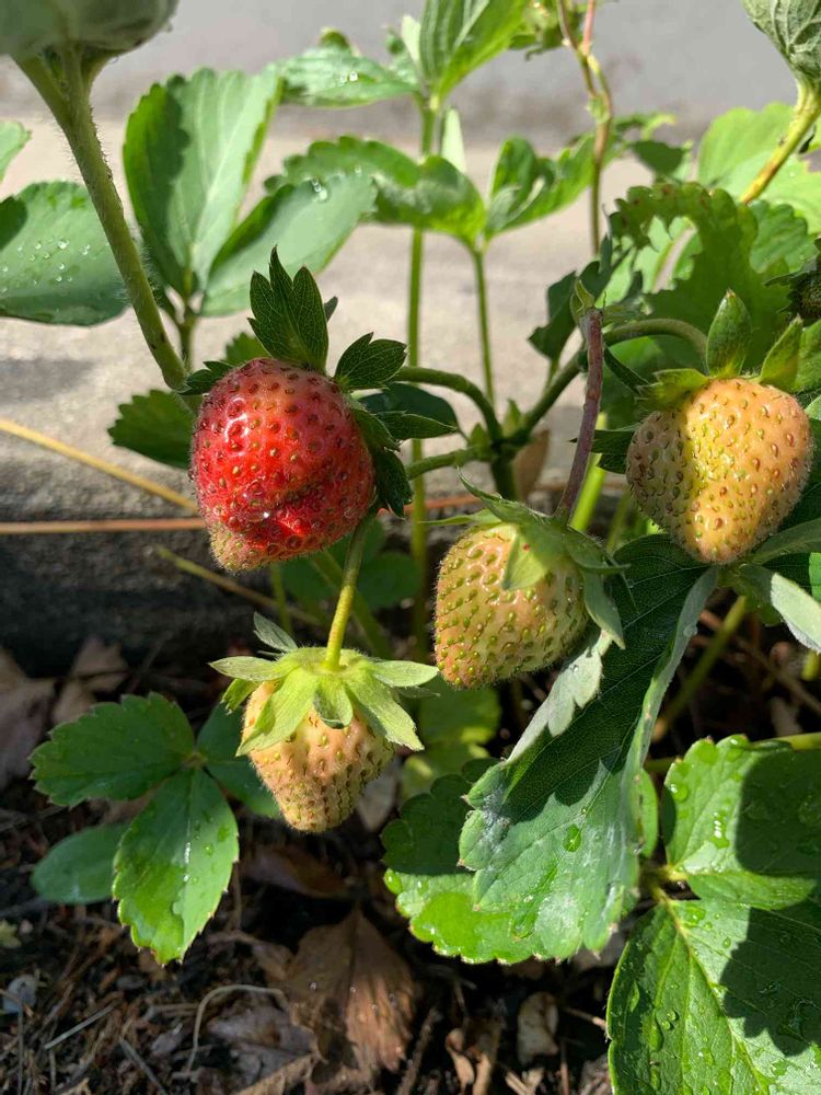 大して土も無い、側溝みたいなところに生えてるイチゴ🍓、色づいてきた)^o^(❤️