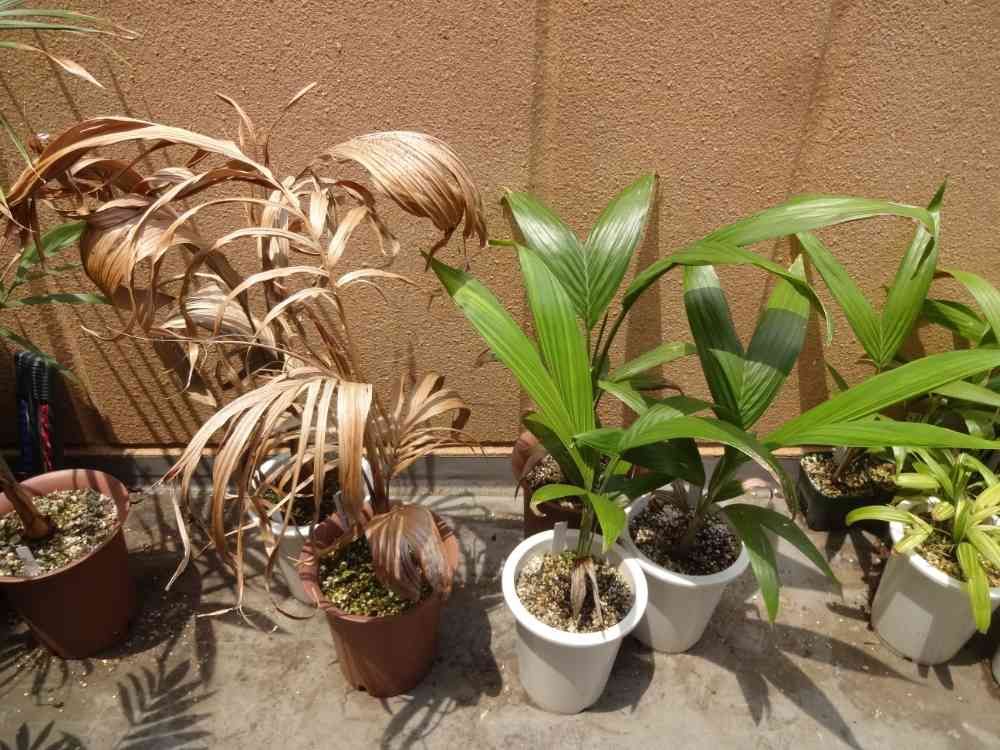 2017年5月撮影とちょっと古い写真ですが、2016~2017年の冬にArchontophoenix alexandrae(本ユスラヤシ)とArchontophoenix cunninghamiana var. Illawarra(イラワラキングパーム)を同じ露天ベランダ無保護という条件で越冬させた結果です。