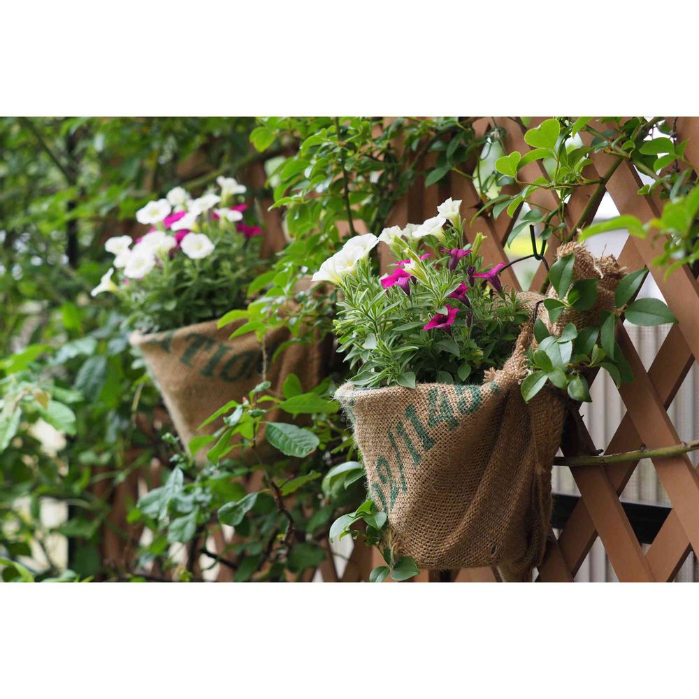 ...と言っても壁掛けのバスケットも無かったので、コーヒーの麻袋があったのを思い出して、安物のスリット鉢を包んで壁に掛けてみました!!