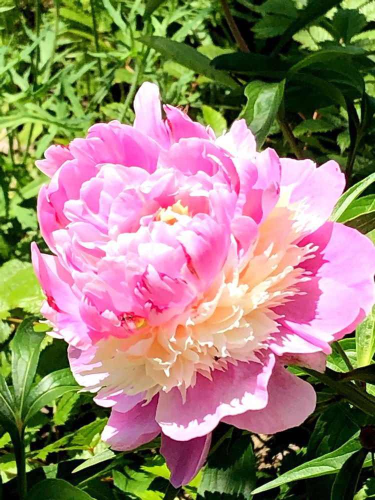 芍薬です。甘いいちごミルク色が美しい。思わずパチリ。日当たりがいい場所が、一番大きく咲いていました。