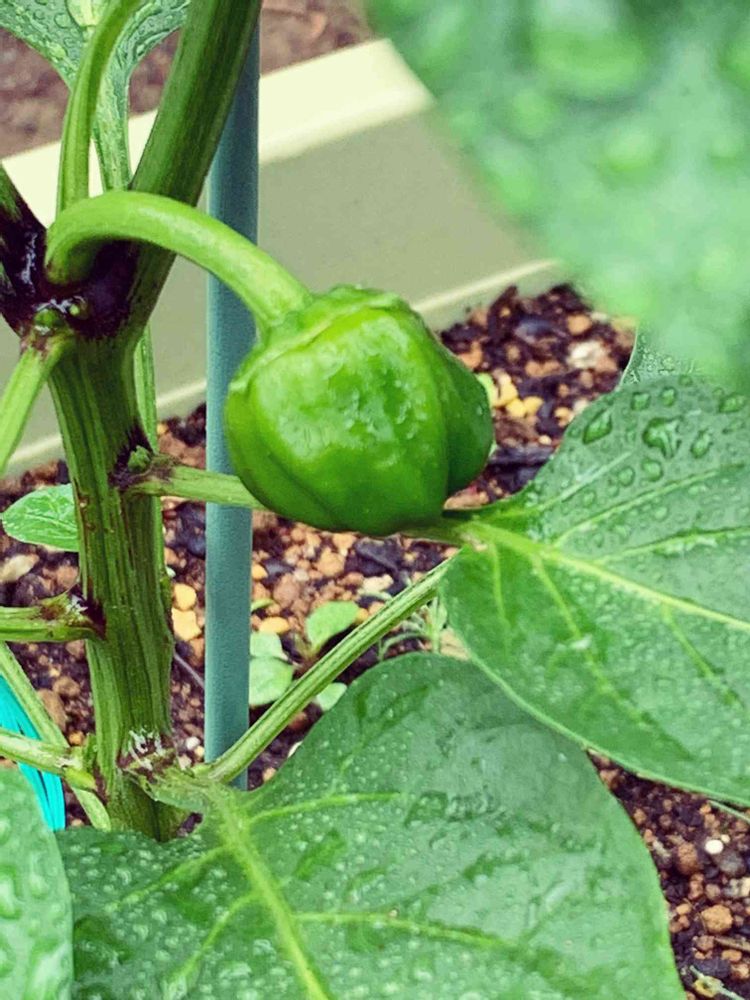おはようございます。㊗️カラーピーマン(赤)の実ができました。早く大きくなって赤く🔴な〜ぁれ!😄😻