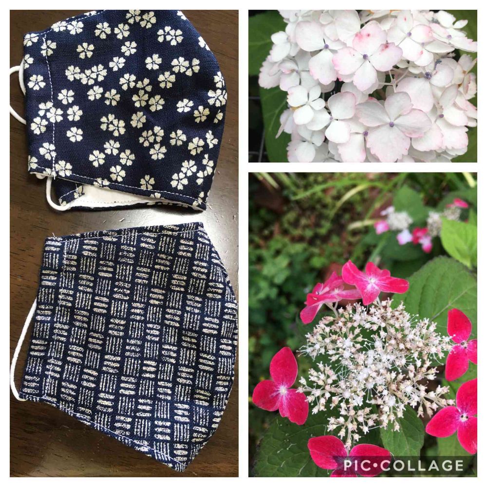 姉から手作りマスクとどきました、まだまだ油断しないでコロナ対策しましょう🙋♀️裏庭に、山紫陽花、紅咲いてます🌸咲き進むうちに紅が濃くなってます、上の紫陽花も少しずつピンク色に変わってます🌸