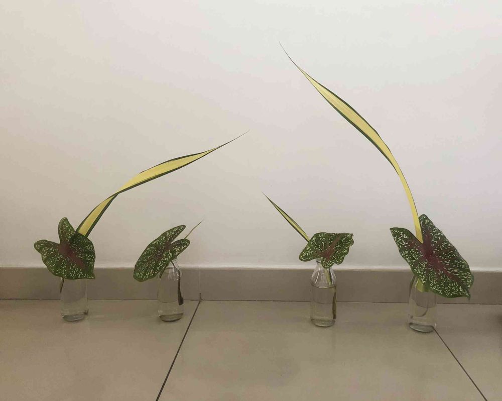 ニューサイラン、カラジウムを瓶に入れて並べてみました。