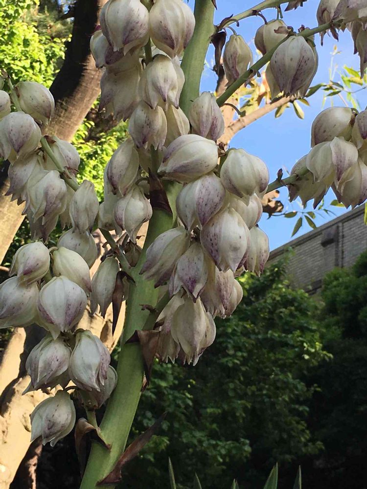 リュウゼツラン、君が代蘭、ユッカ、みんな親戚のようですね。葉にトゲトゲはないようなので、ユッカなのかなあ、と思いました。