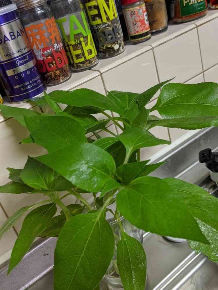 間引いたヒマワリがもったいなくて、とりあえずコップに生けてみた。このまま咲いたりしないかなー。