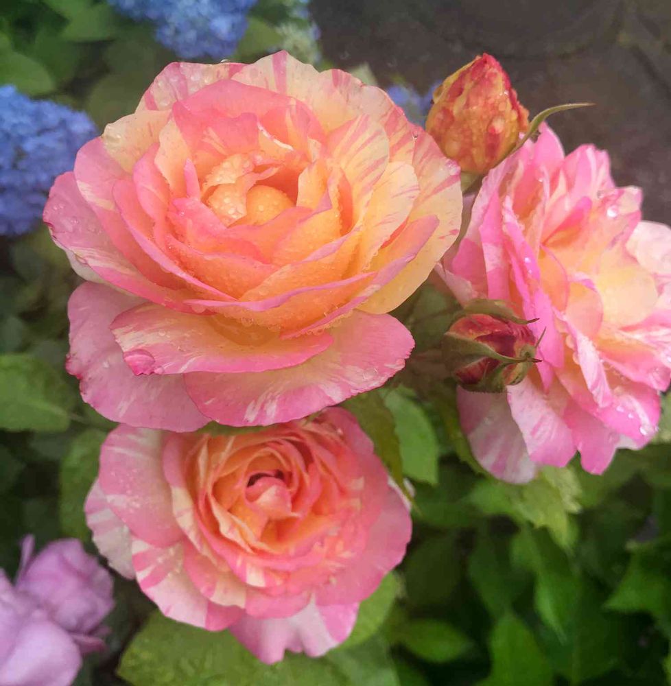 ブルーの紫陽花に囲まれて、華やかに咲いています。