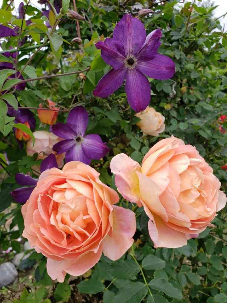 綺麗ですね✨なるほど!シャーロットのそばに紫のクレマチス 💕