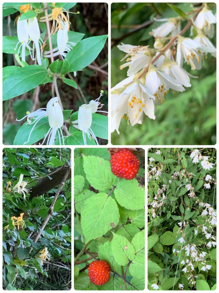 我が家の裏の竹藪に咲いてるウツギやスイカズラです🥰