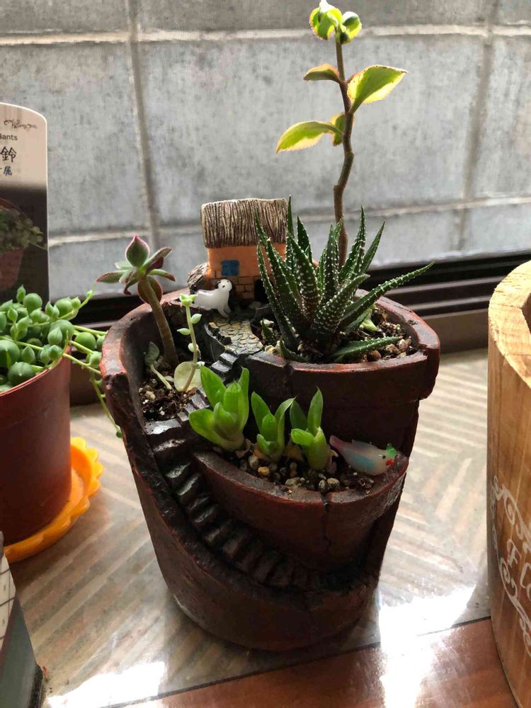 ドールハウスの様に、木や植え込みなどをイメージして、小さく出た芽などを植えたり、乗せて発根させたりと、1年後にカッコ良くなりました。