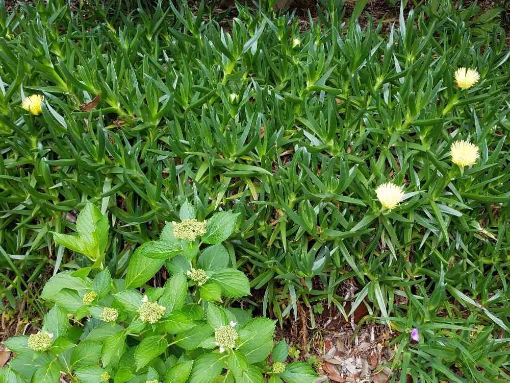 紫陽花の後ろ側に黄色いお花が咲き始めました✨名前がわかっていません😅多分、バクヤギク