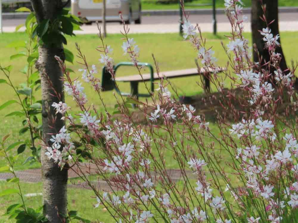 五岳の里公園の一角、ガウラ越しの芝生の中に素敵なベンチがありました。