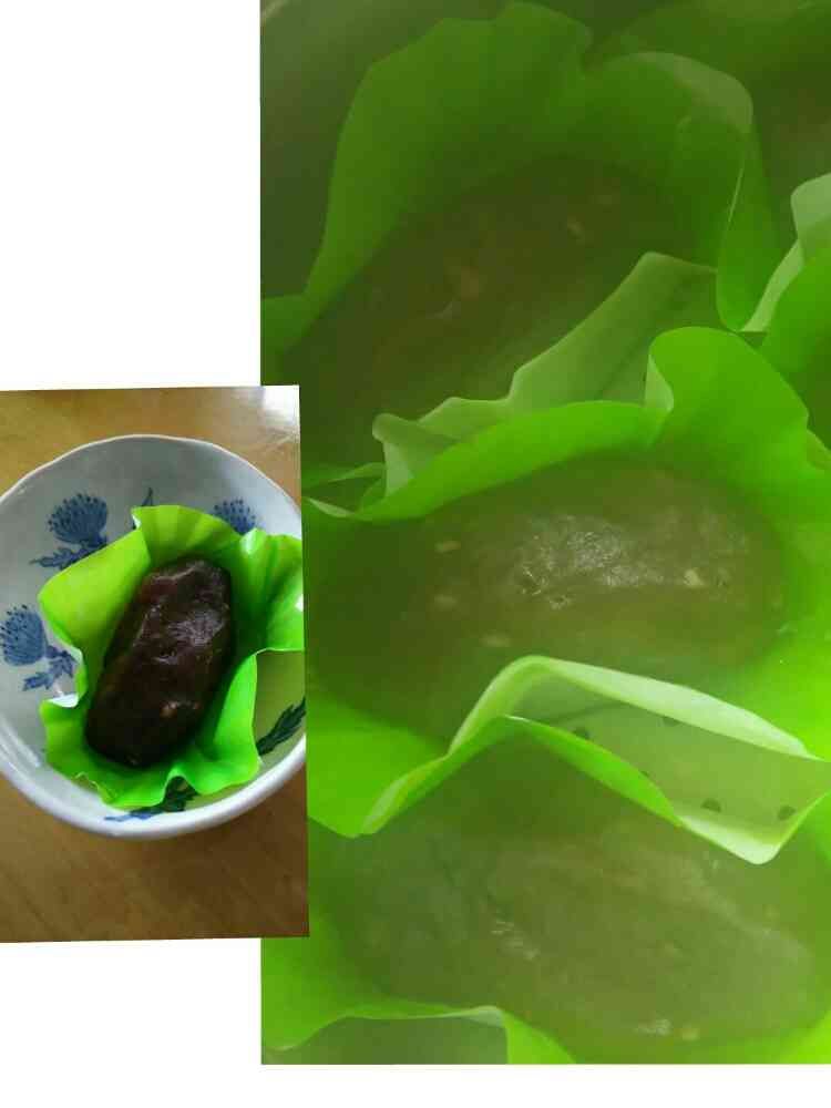 ゆで小豆と米粉を混ぜて葉っぱがないので紙ざらにのせ蒸して
