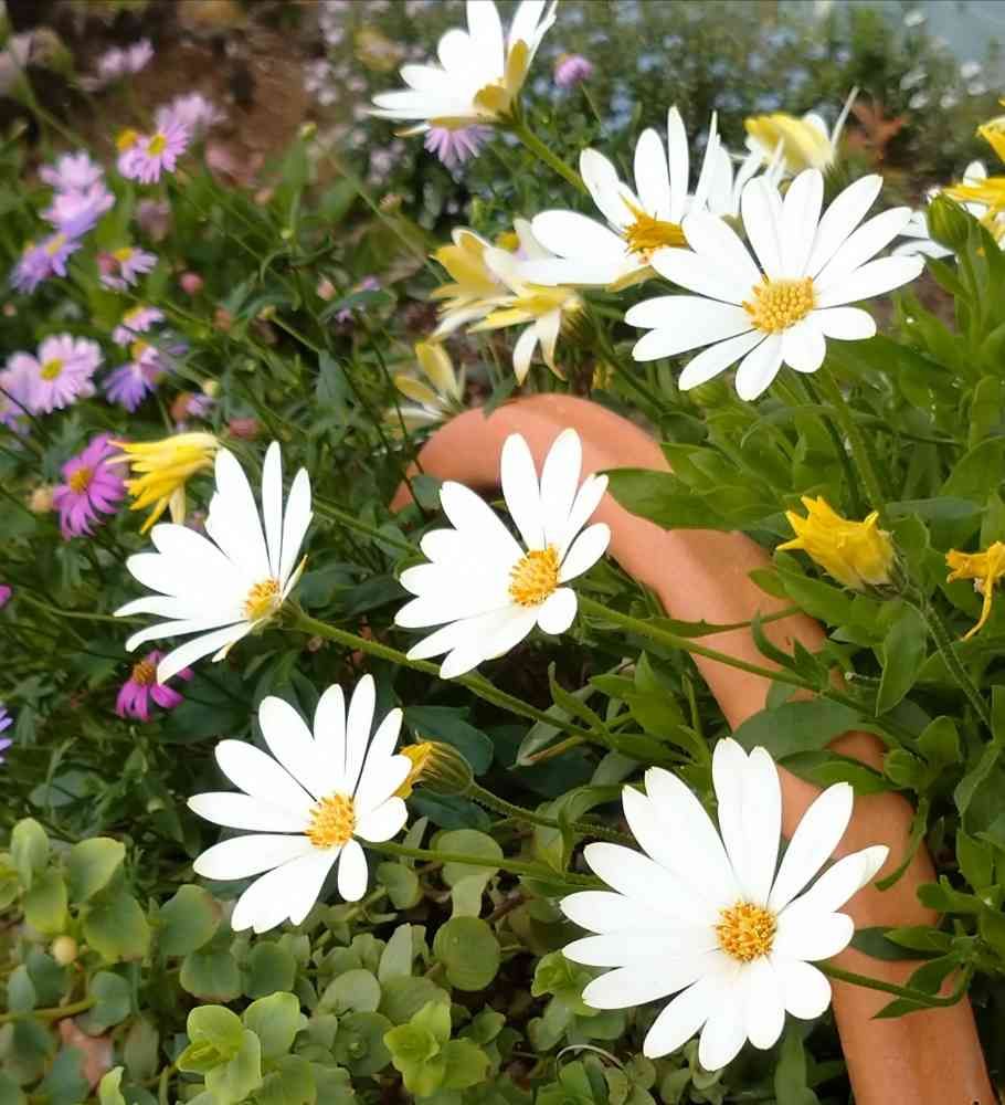 寄せ植えのオステオスペルマム キララ💕そろそろ春のお花は終わりそう。秋にまた咲くらしいのでそれまでは🌿だけで頑張ってね❣️枯らさない様に気を付けます🥰
