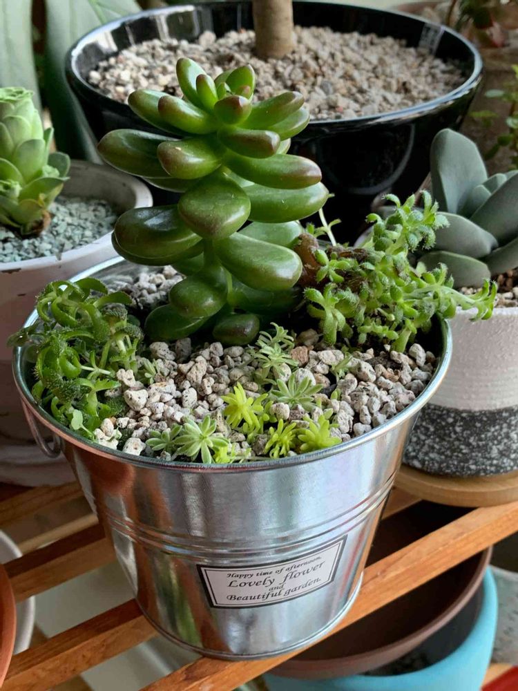最初から徒長😓一本だけで寂しいのでセツローサことトランスバールとセダム丼からむしったセダムを少々寄せました。