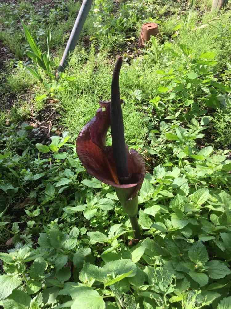 コンニャクは花が咲くと枯れます❗️なので花が咲く前に収穫しないといけないのですが最近は作ることも無くなったので放って置いたようです😰