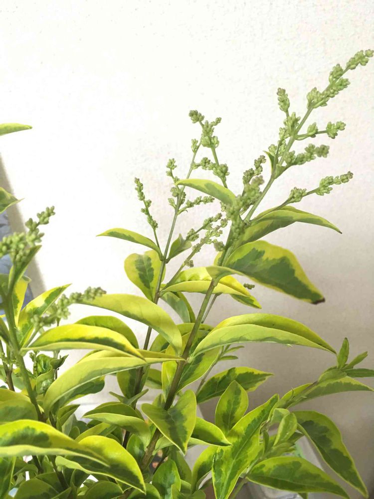 太めの枝ものです!葉は縁が明るい黄緑、葉の中心は濃緑です。先っちょは粒々の実?つぼみ?がついてます。