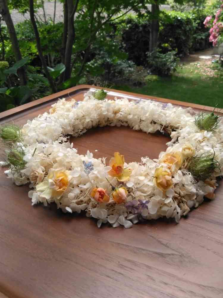 昨年作ったアナベルのリースが汚れてきたので、思い切って漂白してみました。