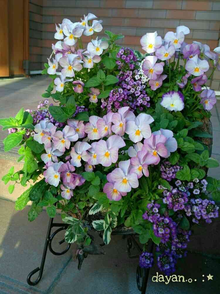 リース型の入り口がちょっと狭くて苦労しましたが、まだまだ咲いてくれるビオラとアリッサムで華やかです💖