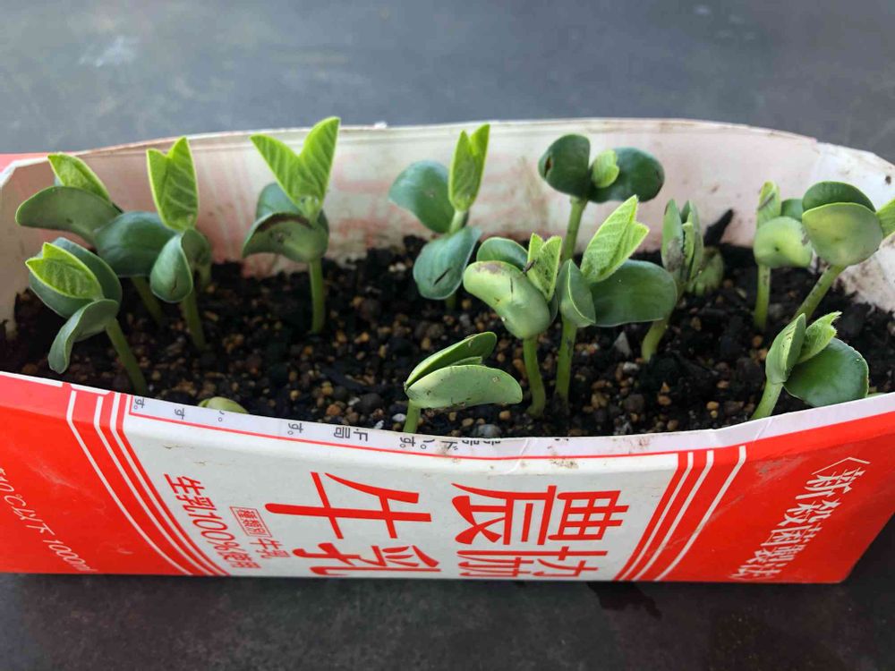 枝豆の発芽。なかなかたくましいです。畑に直播きしたものは、ダンゴムシたちにつつかれて、子葉になるはずの豆の部分がかじられて傷ついてます。保険にベランダで育苗してる分は大丈夫そう!畑は空いてる場所がないけど、せっかくなので、残りはプランター栽培しようかな。