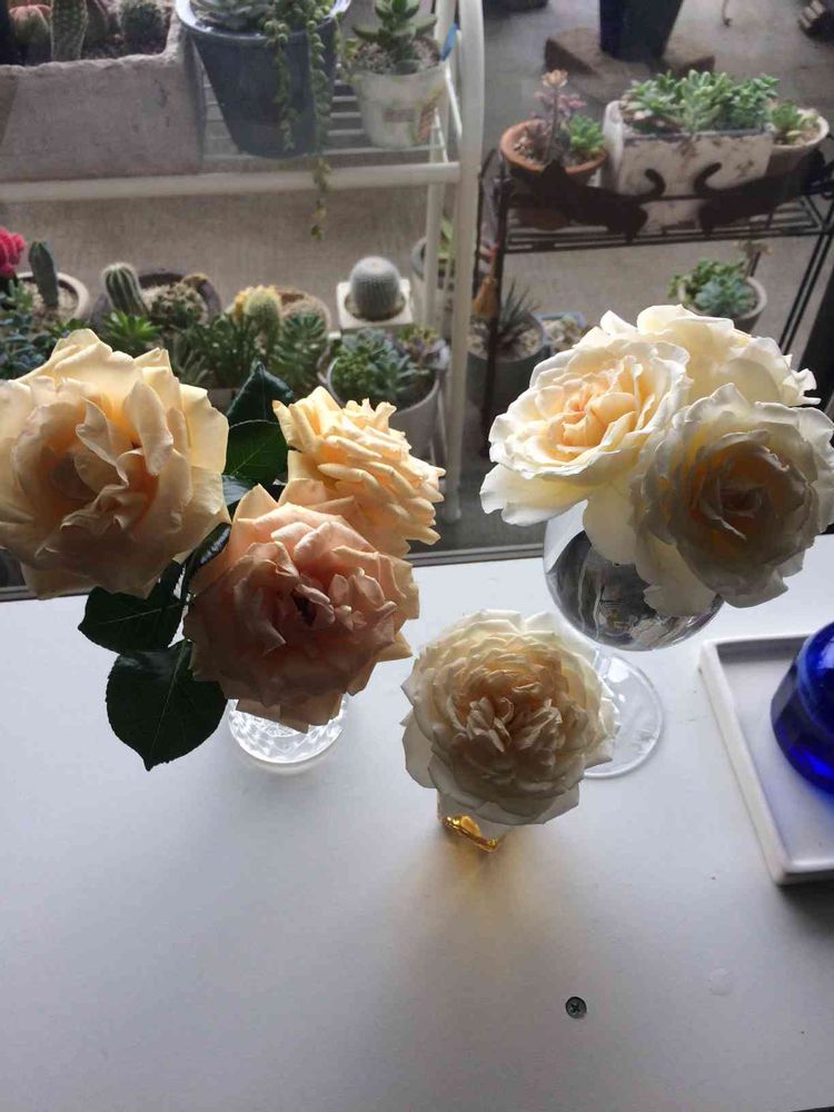 薔薇たち🌹窓辺に飾りましたー(^O^)🎶奥に見えるは次女のサボテンと多肉たち🌵