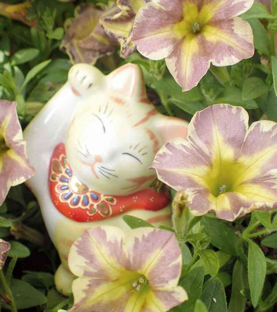 前出の、サフィニアアート・とらネコです。これも九谷焼の招き猫ですが、この花色には、こっちの猫さんの色のほうが近いかなーと😸とらネコというと、濃い茶色に黒の縞というイメージだったので、この招き猫もとらネコだということに気付くのが遅すぎました🤣赤トラもとらネコですものね(*^^)v表情と、少し傾げたポーズがかわいいでしょ😺ちょっと変わり種のまねき猫さんでお気に入りなんです😻