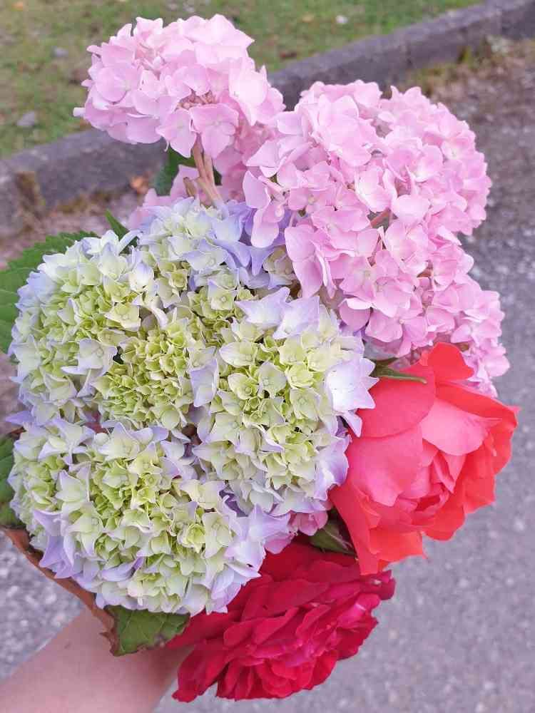 子供を連れて散歩していたらご近所さんに紫陽花と薔薇をいただきました🎶
