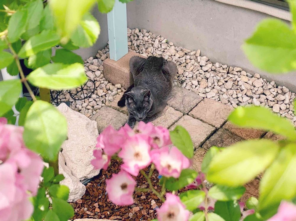 🐱テムチンちゃん💓お花がいっぱいの大好きなお庭でのんびりしてねー😸💤🐈