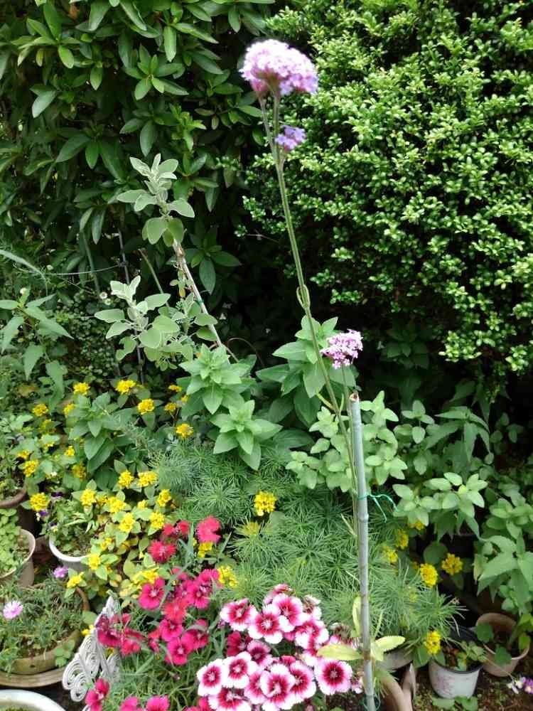 三尺バーベナの高さが1mを超え、支柱が必要になった。セージと桔梗は今年も咲きそう!