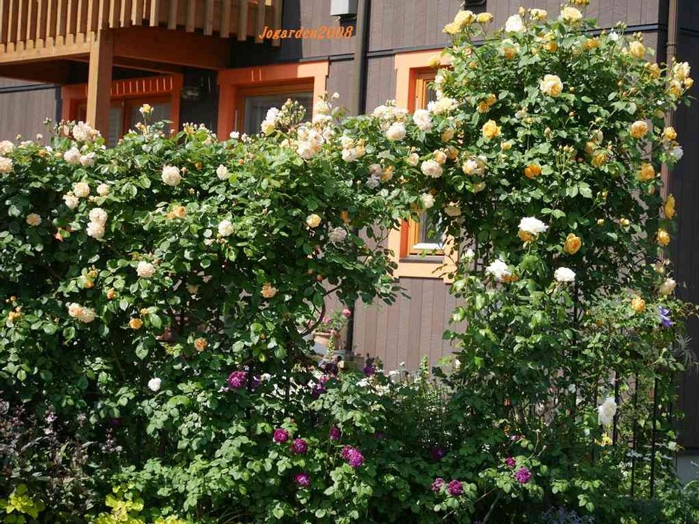 トレリスに誘引していたバフ・ビューティの枝を、アーチまで伸ばして、もう一つバラのアーチを作りました。まるで小窓のようになり、道路側から覗くと庭の中が見える面白いコーナーになりました。
