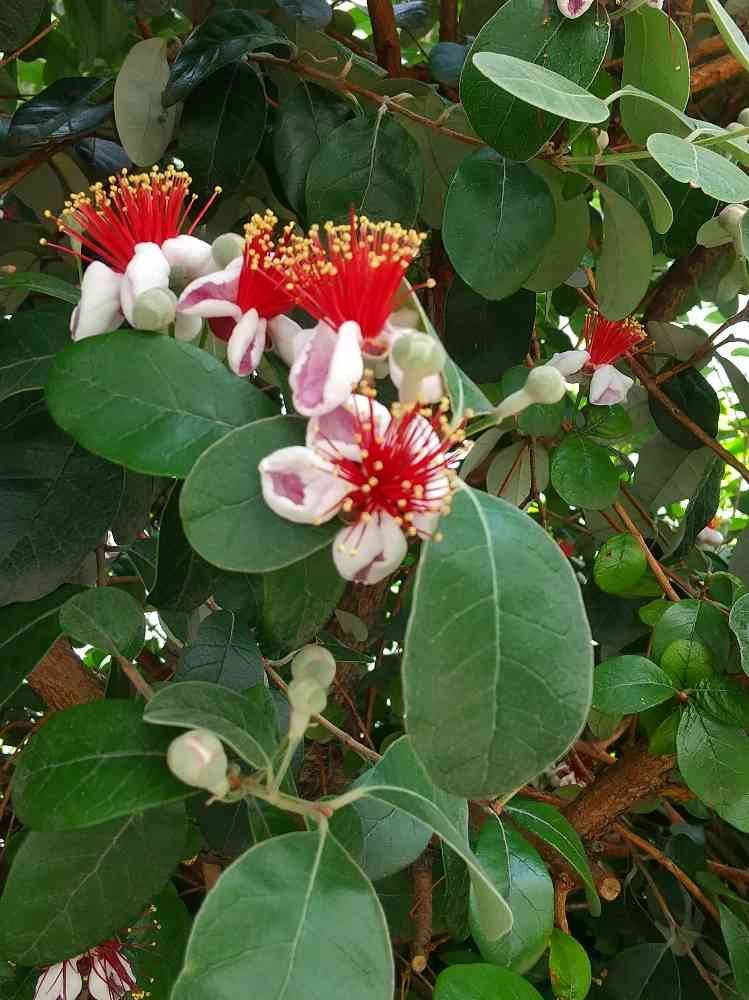 フェイジョアをネットで調べて行くと、🌸花も食べられ甘いそうで、実も熟すと甘いそうです。葉っぱも可愛いです。 明日こっそり食べようかと企んでます😆