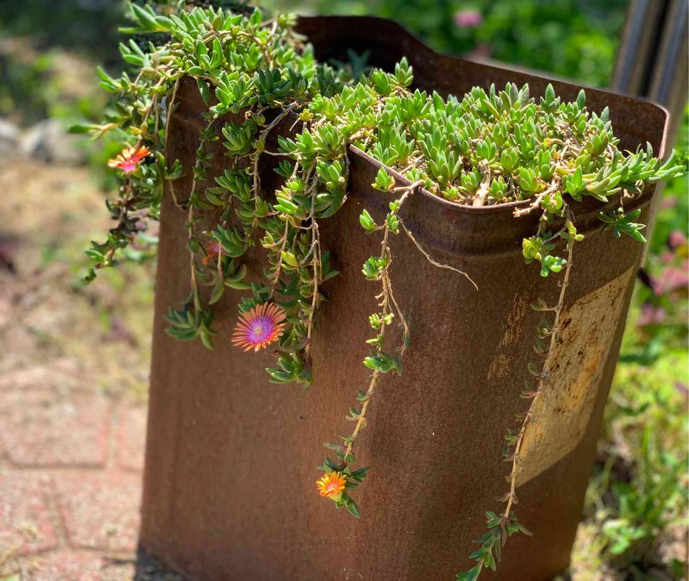 おはよう😎タライも素敵じゃないのよ🤭✨一斗缶もサビサビていつ穴開く事やら(˶‾᷄ꈊ‾᷅˵ )普通のマツバギクのオレンジは咲いたわよ🙋♀️