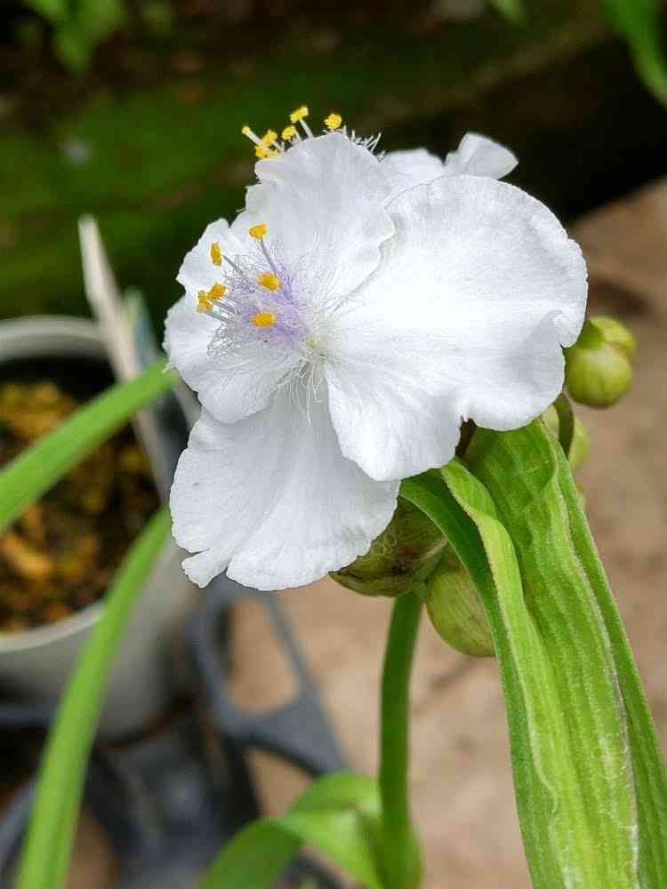 ムラサキツユクサの脇に一輪だけ白い花(植えた覚え無し)😵🌼