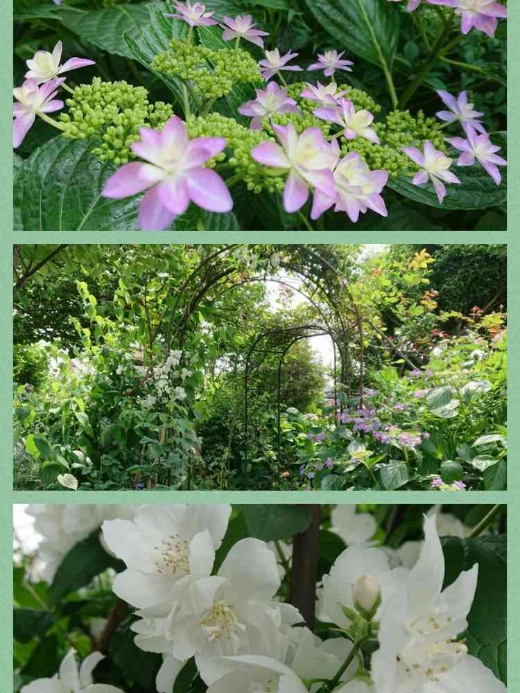 左側からバイカウツギがアーチの上で出会っています💮🌿
