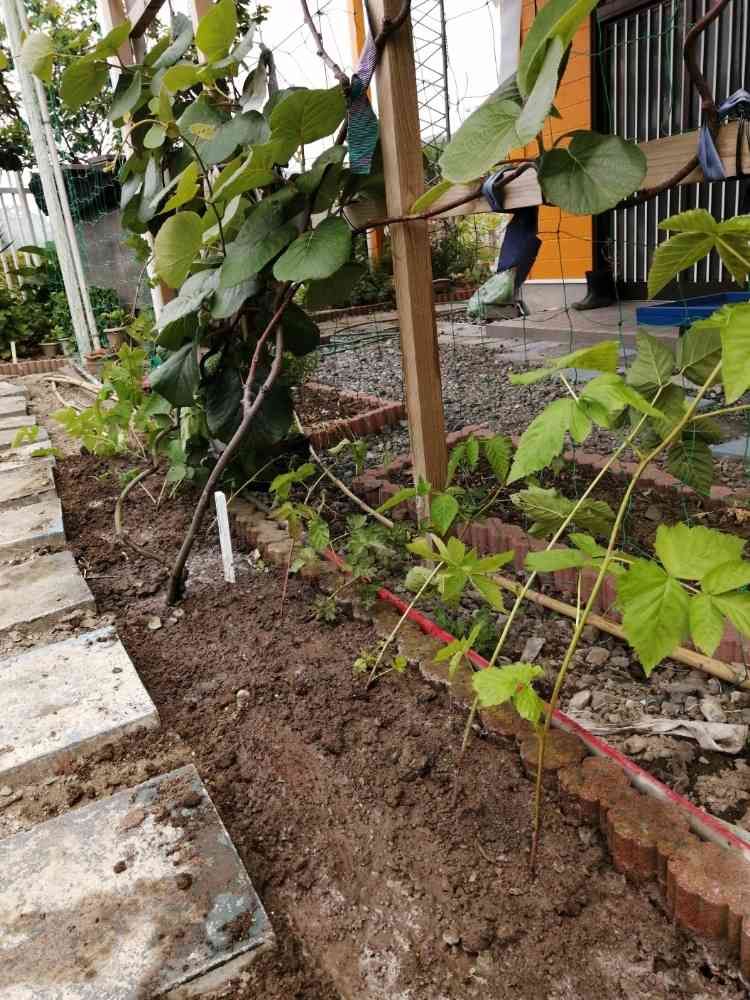 2018年に植えたラズベリーがジャングル状態に育ってきたので、10株ほどに株分けしキウイのそばの隙間に植えました。ここも数年でラズベリージャングルになるでしょう。