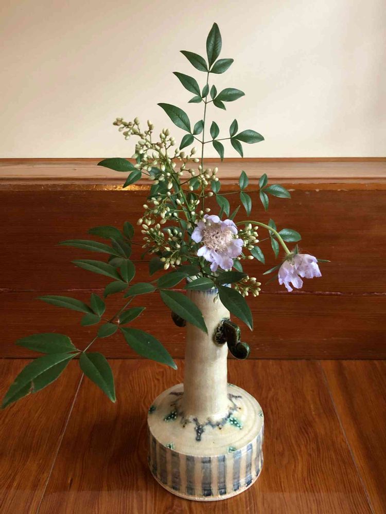 6月3日、南天を剪定中お花の先が折れてしまったので葉っぱと松虫草を添えて小さな花瓶にさしてみました🤍🌿