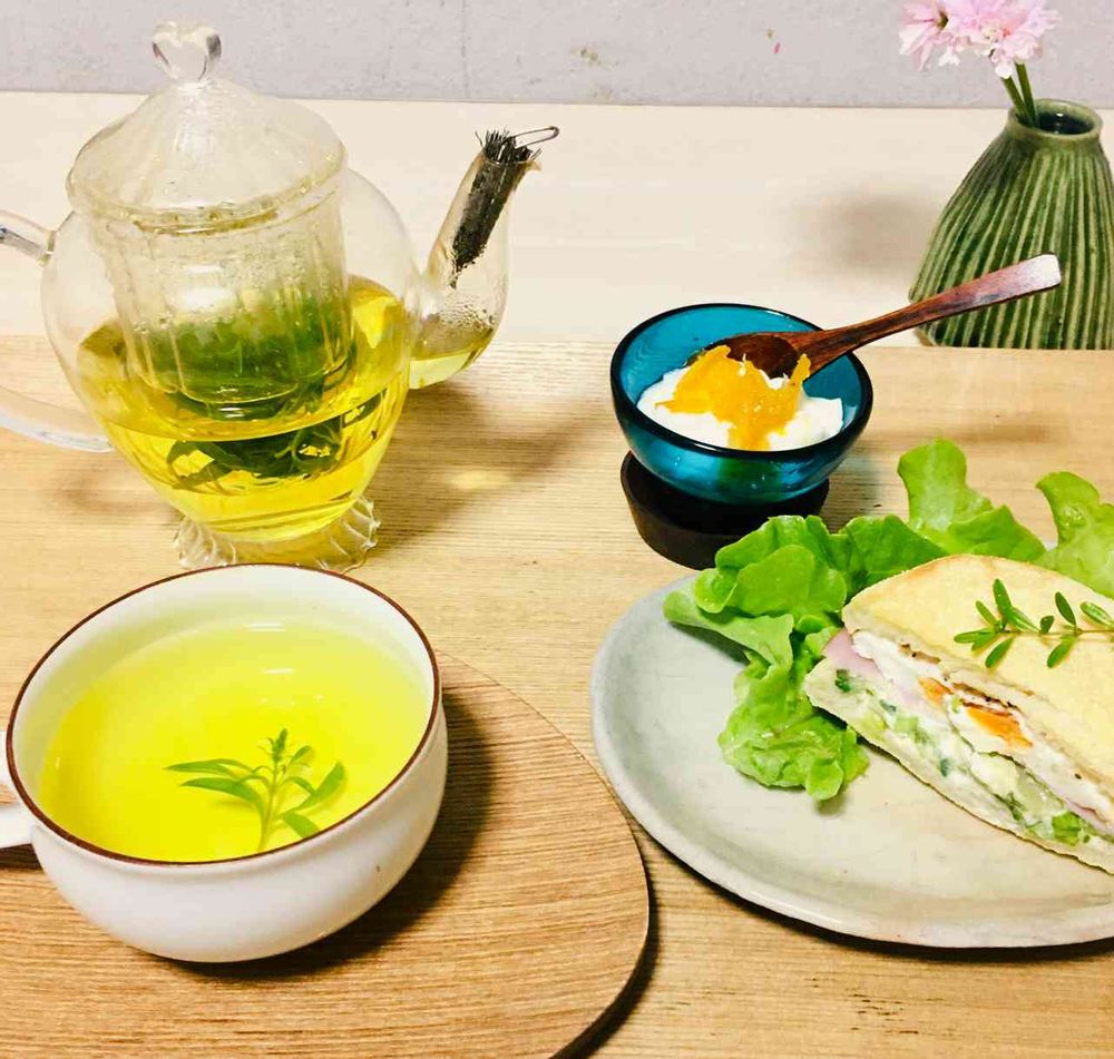 サンドイッチはお友達の家庭菜園です頂いたブーケレタス🥬新玉葱🧅ルッコラ、コリアンダーが入ってます‼️うまし👍😋