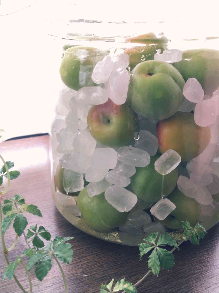 ガラス越しにみえる青梅と氷砂糖が涼しげ。