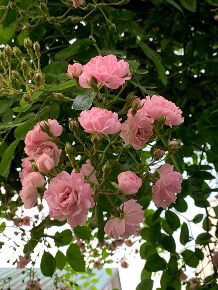 修景バラ プリンセスピーチの一枝🌿です☺️ボール状にかわいい💕サーモンピンクの花がたくさん咲いています。つぼみもまだまだたくさんあります✨まだしばらく楽しめそうです。
