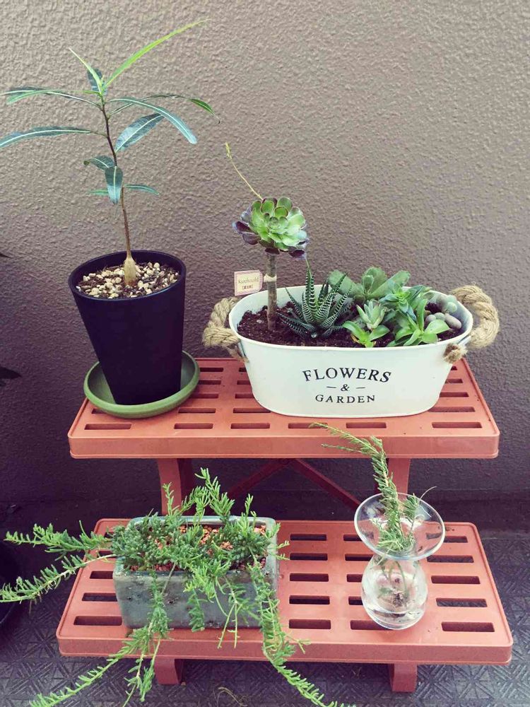 見よう見まねで多肉植物の寄せ植えを初めてやってみました。(右上)