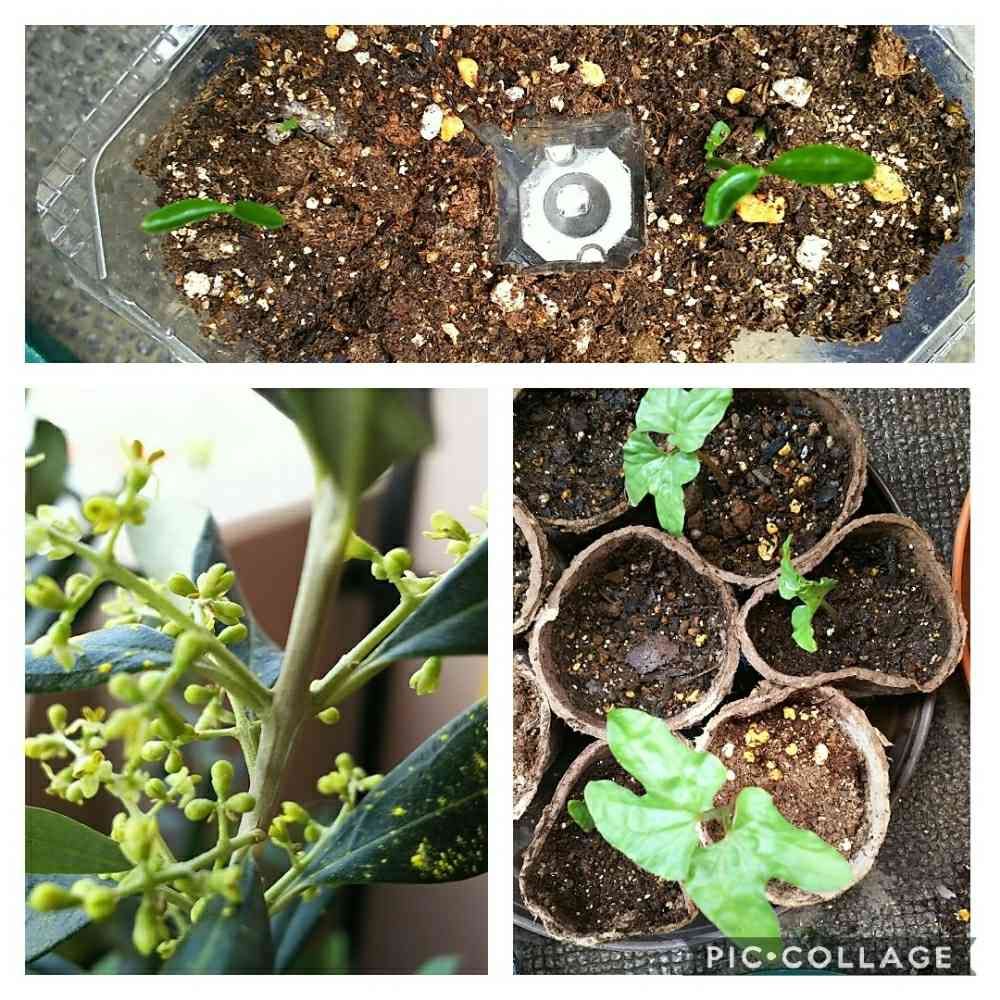 上) 発芽した夏みかんも土に植えたら緑の小さな🍃が出てきた。