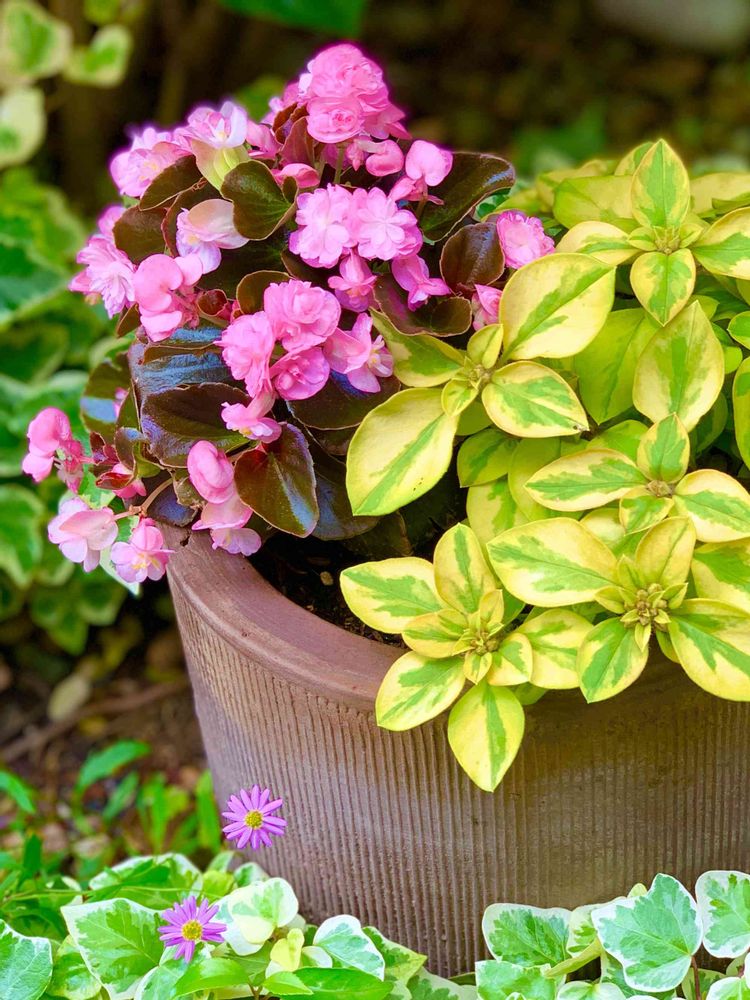涼しげに咲き始めた八重咲きベゴニアは日向を好むけど、リシマキアは日陰の方がイイらしく…一緒に寄せ植えしたのを悔いてます💦この酷暑ではお別れするしか無いですね😭
